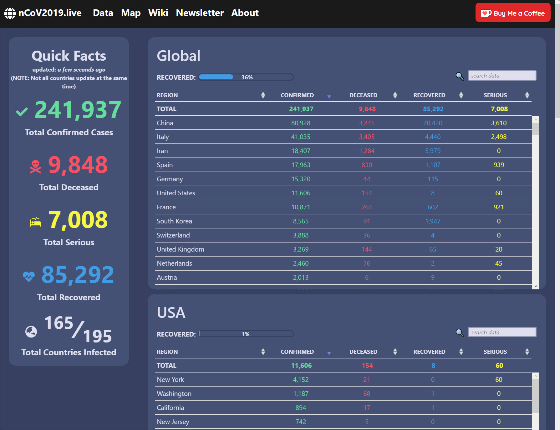 Avi Schiffmann, a 17-year-old high school junior from Mercer Island Washington, created the nCoV2019.live website back in December when the virus was initially gaining ground. As of the date of this article Schiffmann’s coronavirus tracking website reports 241,937 total confirmed cases, 9,848 deceased, 7,008 serious and 85,292 recovered of a total of 165 of 195 countries tracked.