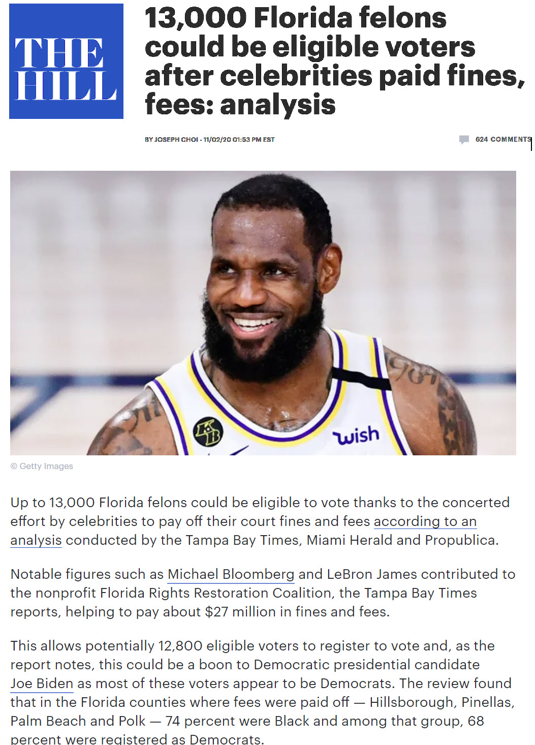 Florida (Nov. 2, 2020 1:53 pm) — Up to 13,000 Florida felons could be eligible to vote thanks to the concerted effort by celebrities to pay off their court fines and fees according to an analysis conducted by the Tampa Bay Times, Miami Herald and Propublica.